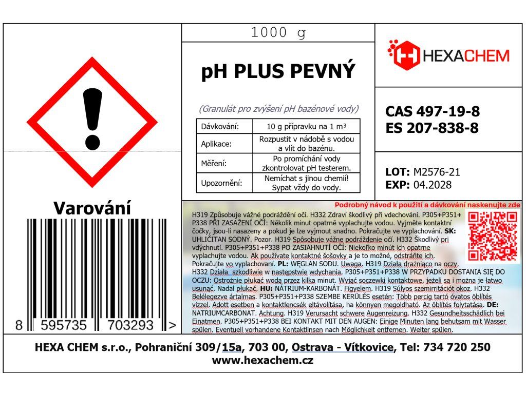 Pro zvýšení hodnoty pH o 0,2 (např. z 6,8 na 7,0) přidejte cca 10 g přípravku na 1 m³ (1 000 l) vody. (Poznámka: Dávkování je závislé na tvrdosti vody, vždy postupujte po menších dávkách).