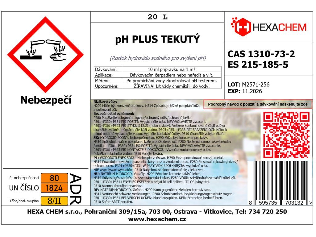 | Dávkování | cca 10 ml na 1 m³ (pro zvýšení o 0,1-0,2 pH) |