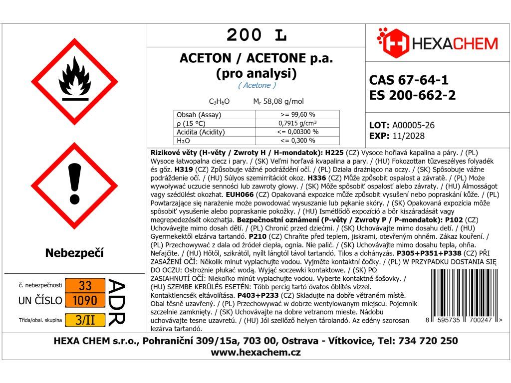 Aceton v laboratorní kvalitě p.a. (Pro Analysi) je bezbarvá, silně těkavá kapalina s charakteristickým aromatickým zápachem. Jedná se o nejjednodušší keton, který se díky své vysoké čistotě po odpaření beze zbytku vytrácí. Je to jedno z nejúčinnějších rozpouštědel pro organické látky.