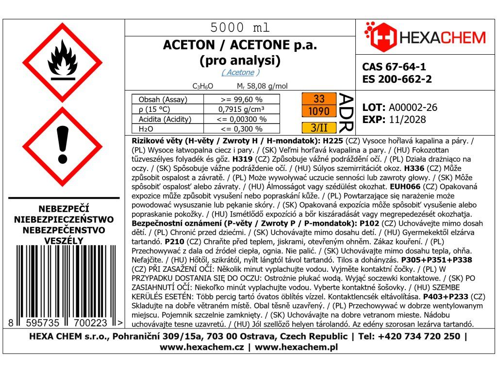 | Silniční klasifikace | UN 1090, Aceton, 3, II, (D/E), Přepr. kat.: 2, Ohrožující živ. prostředí : ne, Klasif. kód: F1 |