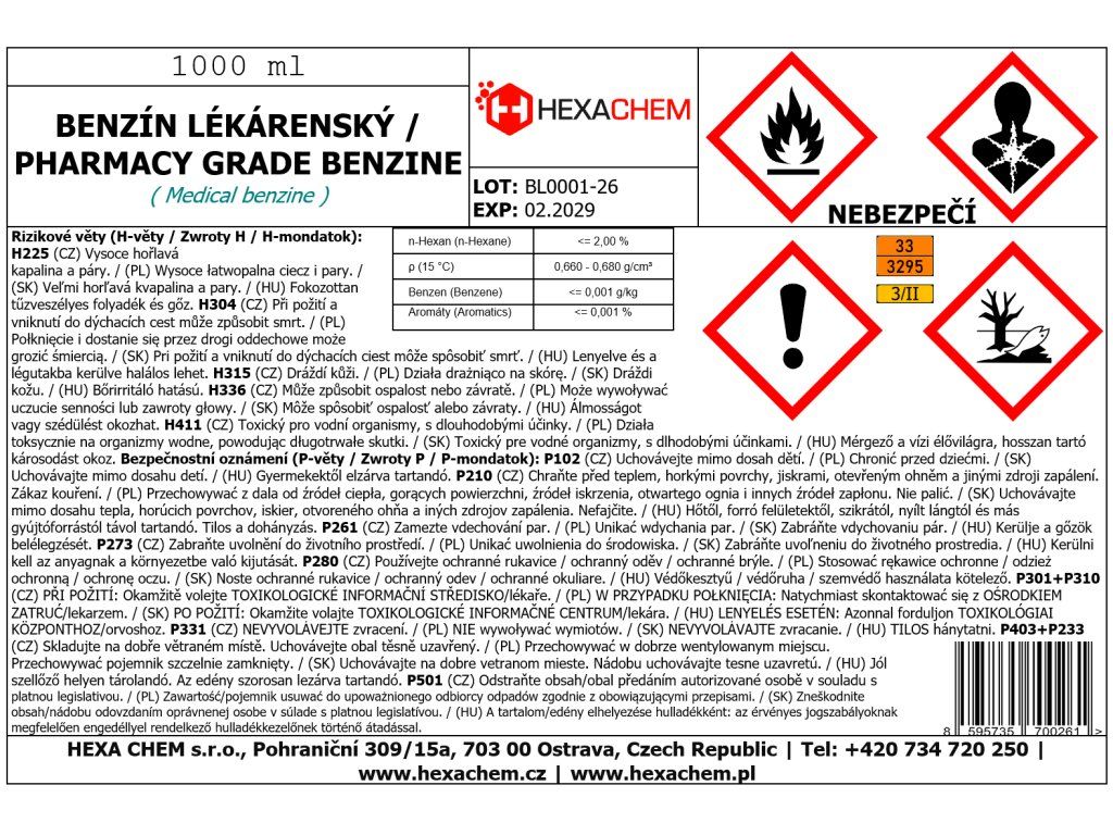 Benzín lékárenský (čistý technický benzín) je vysoce rafinovaný lehký petrolejový destilát. Jedná se o čirou, bezbarvou kapalinu s typickým zápachem, která se vyznačuje mimořádnou čistotou a úzkým rozmezím bodu varu. Na rozdíl od běžných ředidel neobsahuje olejové příměsi, a proto se po aplikaci beze zbytku odpařuje. Tento produkt se vyznačuje extrémní čistotou (obsah aromátů a benzenu pod 0,001 %), díky čemuž je ideální pro nejnáročnější odmašťování a laboratorní účely.