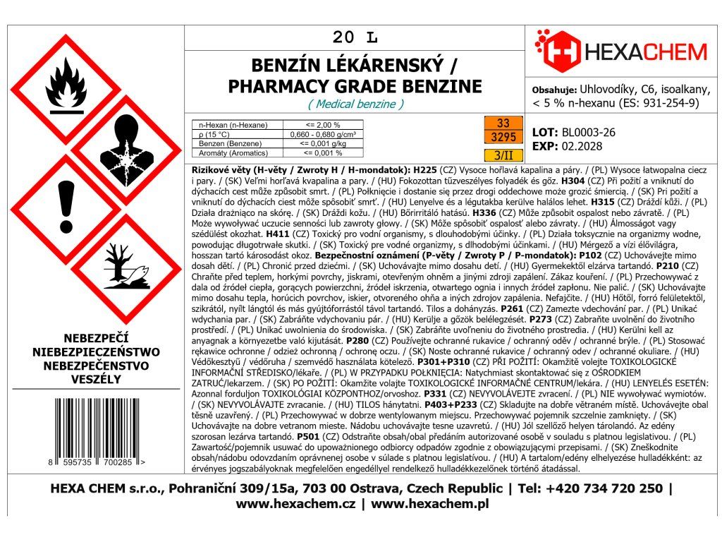 Benzín lékárenský (čistý technický benzín) je vysoce rafinovaný lehký petrolejový destilát. Jedná se o čirou, bezbarvou kapalinu s typickým zápachem, která se vyznačuje mimořádnou čistotou a úzkým rozmezím bodu varu. Na rozdíl od běžných ředidel neobsahuje olejové příměsi, a proto se po aplikaci beze zbytku odpařuje. Tento produkt se vyznačuje extrémní čistotou (obsah aromátů a benzenu pod 0,001 %), díky čemuž je ideální pro nejnáročnější odmašťování a laboratorní účely.
