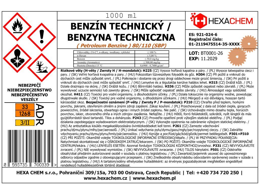 Benzín technický 80/110 (SBP) je směs nasycených uhlovodíků, která slouží jako jedno z nejrozšířenějších rozpouštědel v průmyslu a dílnách. Vyznačuje se silnou odmašťovací schopností a rychlým odpařováním. Je ideální pro hrubé čištění a přípravu povrchů, kde není vyžadována absolutní čistota lékárenského benzínu.