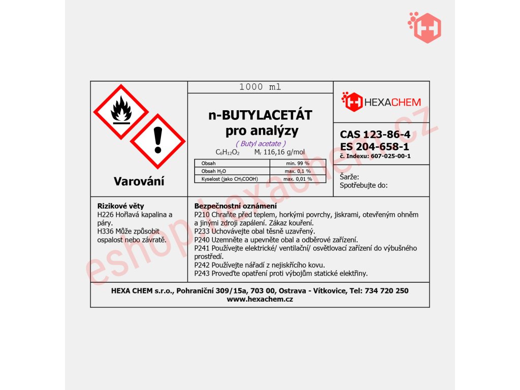 Popis: Butylacetát, chemická sloučenina esteru kyseliny octové a butanolu, je bezbarvá kapalina s charakteristickou ovocnou vůní, která je často využívána pro své rozpouštěcí vlastnosti. Tato forma butylacetátu je specificky připravena pro analýzu a laboratorní použití, kde je požadována vysoká čistota a konzistence.
