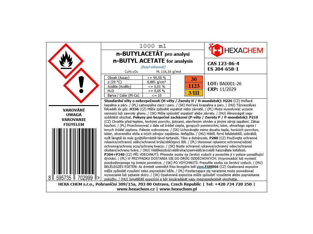 n-Butylacetát v laboratorní kvalitě p.a. (n-butyl ester kyseliny octové) je čirá, bezbarvá kapalina se sladkou ovocnou vůní připomínající banány nebo hrušky. Jedná se o jedno z nejpoužívanějších rozpouštědel v průmyslu barev a laků, protože má střední rychlost odpařování a výbornou schopnost rozpouštět polymery.