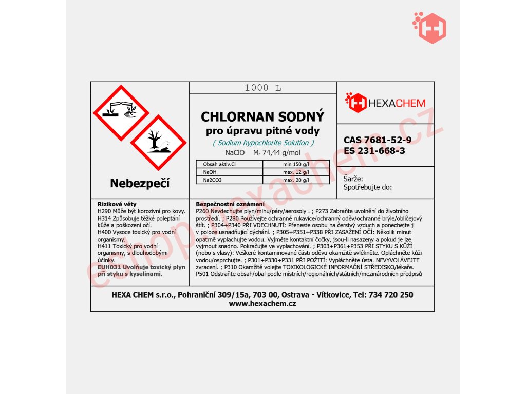 - Chlornan sodný je silné oxidační činidlo a může způsobit podráždění kůže, očí a dýchacích cest. Při manipulaci používejte ochranné rukavice, brýle a vhodné ochranné oblečení.