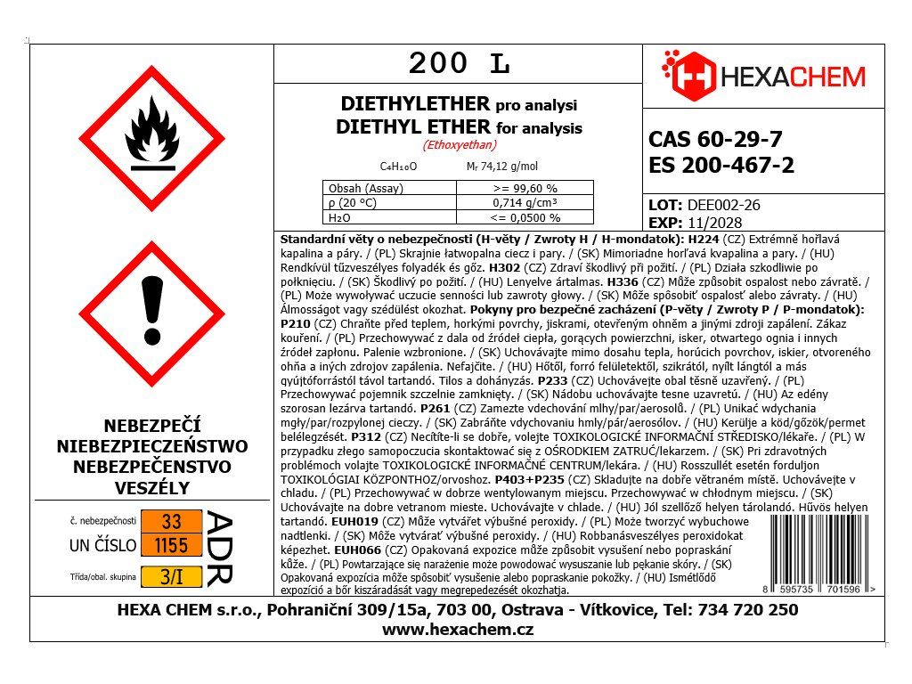 Diethylether v laboratorní kvalitě p.a. (Pro Analysi) je čirá, bezbarvá a extrémně těkavá kapalina s charakteristickým nasládlým zápachem. Jedná se o jedno z nejdůležitějších laboratorních rozpouštědel, které díky své vysoké čistotě a velmi nízkému bodu varu umožňuje šetrnou manipulaci s citlivými látkami. Rychle se odpařuje, což je ideální pro extrakce a separace.