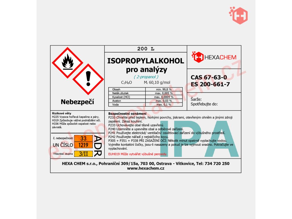 Bezpečnostní opatření: Isopropylalkohol je vysoce hořlavý a může být toxický při inhalaci vysokých koncentrací. Je důležité používat ho v dobře větraných prostorech a nosit ochranné vybavení, jako jsou rukavice a ochranné brýle. Uchovávejte mimo dosah dětí a zdroje tepla.