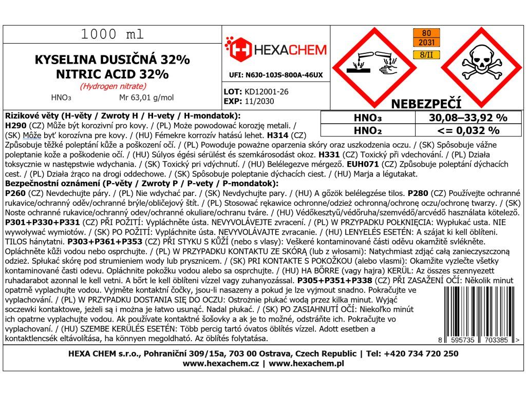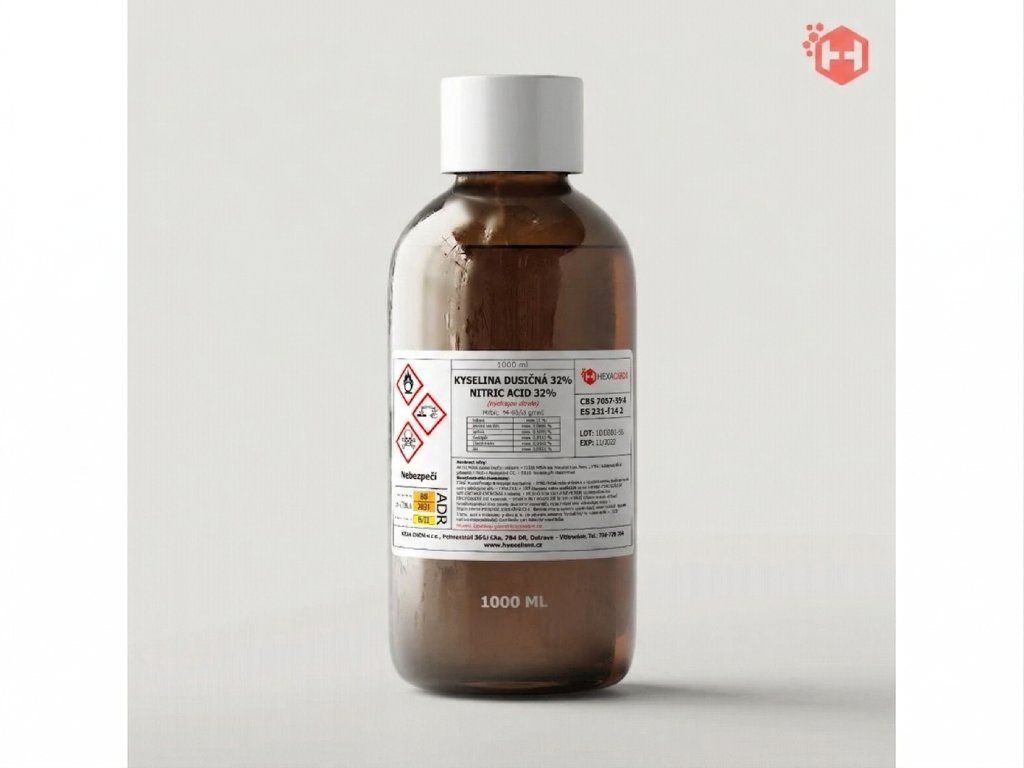 Kyselina dusičná 32 % je anorganická kyselina s oxidačními vlastnostmi, určená především pro odborné, technické a profesionální použití. Jedná se o bezbarvou až slabě nažloutlou kapalinu s charakteristickým ostrým zápachem, která nachází uplatnění v technických provozech, při úpravách povrchů i ve vybraných chemických a průmyslových procesech.