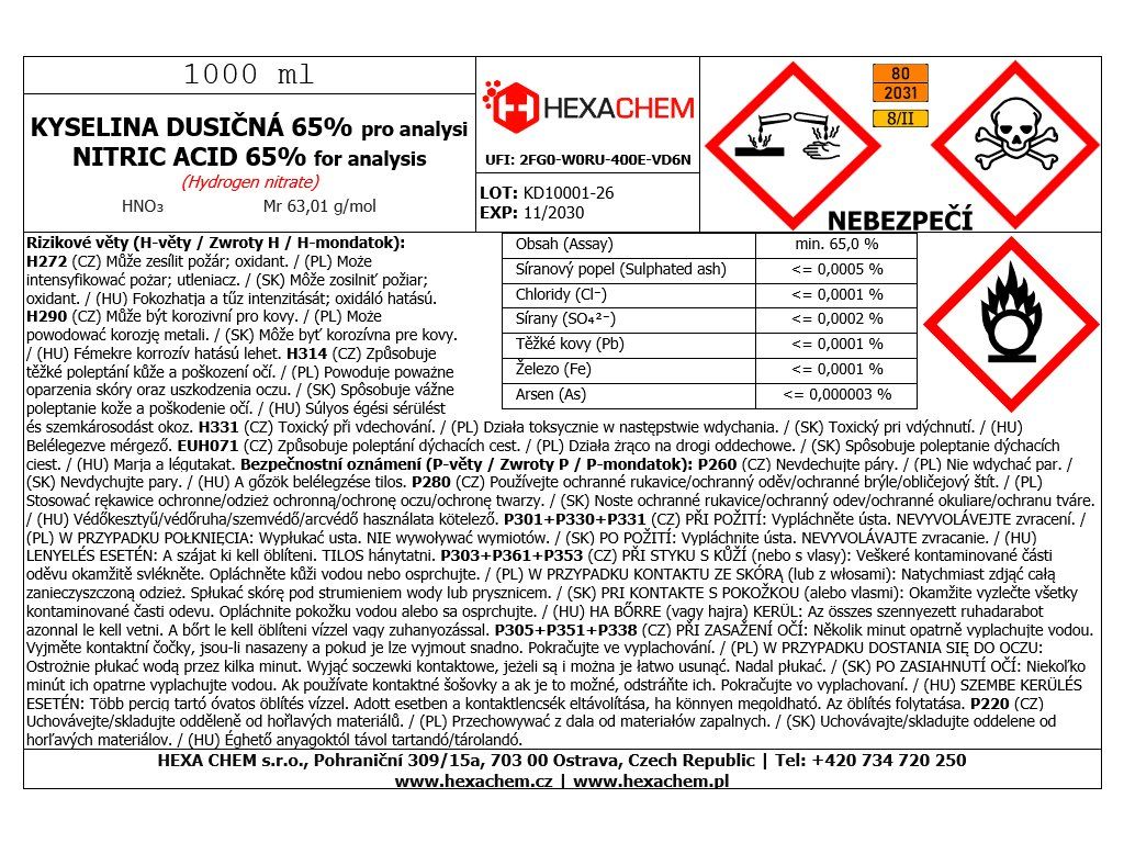 Kyselina dusičná 65 % p.a. (Pro Analysi) je vysoce čisté laboratorní činidlo určené pro náročné odborné použití tam, kde nestačí běžná technická kvalita. Jedná se o bezbarvou až slabě nažloutlou kapalinu s charakteristickým ostrým zápachem, která se vyznačuje silnými oxidačními vlastnostmi a vysokou reaktivitou.