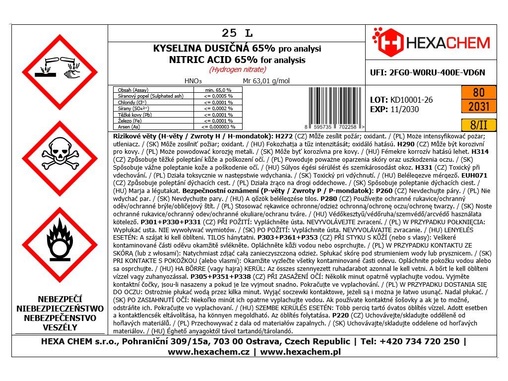 Kyselina dusičná 65 % p.a. (Pro Analysi) je vysoce čisté laboratorní činidlo určené pro náročné odborné použití tam, kde nestačí běžná technická kvalita. Jedná se o bezbarvou až slabě nažloutlou kapalinu s charakteristickým ostrým zápachem, která se vyznačuje silnými oxidačními vlastnostmi a vysokou reaktivitou.