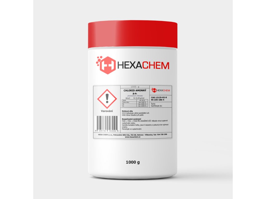 Chlorid amonný p.a. (NH₄Cl) je anorganická sloučenina s vysokou čistotou, která se vyskytuje ve formě bílých krystalů. Vzniká reakcí amoniaku s kyselinou chlorovodíkovou. Je snadno rozpustný ve vodě, vytváří slabě kyselé roztoky a v suchém stavu je stabilní. Při zahřívání sublimuje, tj. rozkládá se na amoniak a chlorovodík.