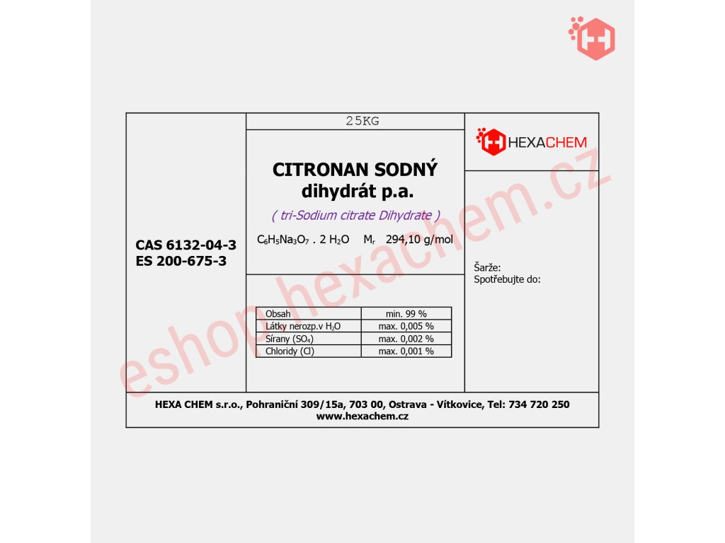 Citronan sodný dihydrát je dobře rozpustný ve vodě a jeho hlavní využití zahrnuje regulaci kyselosti a pH v různých roztocích. Díky schopnosti vázat kovové ionty se často používá jako stabilizátor v potravinářských a farmaceutických formulacích, zlepšuje konzistenci a trvanlivost produktů. V laboratořích se citronan sodný využívá při přípravě pufrů pro biochemické reakce a jako komponenta v elektroforetických gelů.