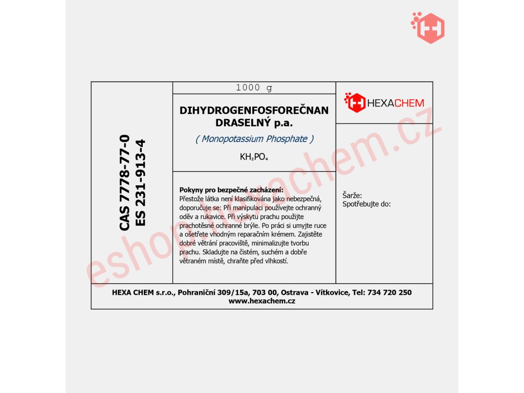 Dihydrogenfosforečnan draselný (KH₂PO₄) je bílá krystalická látka s vysokou rozpustností ve vodě. V laboratorní praxi se často používá jako pufrovací činidlo pro stabilizaci pH, zejména v biochemii a analytické chemii. V průmyslu slouží jako zdroj draslíku a fosforu pro výrobu hnojiv, což je klíčové pro zdravý růst rostlin. Díky své vysoké čistotě je ideální pro přesné analytické aplikace, chemické syntézy a při přípravě roztoků pro různé experimenty.