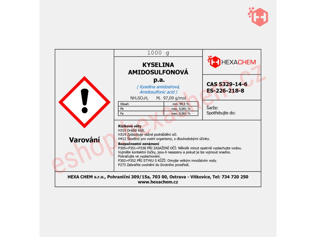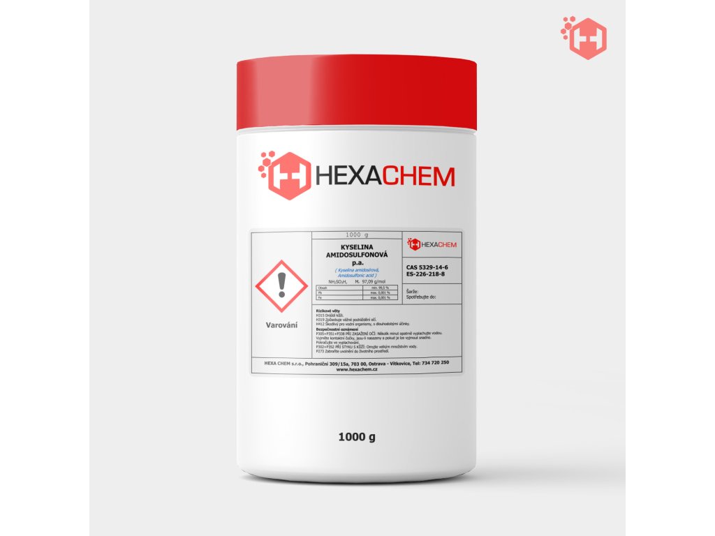 Popis: Kyselina amidosulfonová p.a. je bílý, krystalický prášek, který je dobře rozpustný ve vodě a působí jako silná kyselina. Její schopnost rychle a účinně rozpouštět vápenaté usazeniny a jiné minerální nečistoty ji činí ideální pro použití v čističích a jako deskaletizátor. Tato kyselina je také ceněna pro své vlastnosti jako katalyzátor v syntéze a polymeraci.
