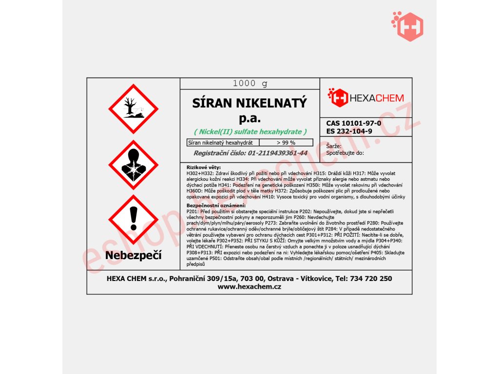 Síran nikelnatý (NiSO₄) je zelená krystalická látka, která je důležitým zdrojem niklu pro různé průmyslové procesy. V galvanotechnice se používá při niklování, kde poskytuje hladký a lesklý povrch kovovým předmětům. V laboratořích se síran nikelnatý využívá v analytické chemii, zejména při stanovení síranových iontů a dalších analytických metodách. V chemickém průmyslu je základní složkou pro syntézu dalších sloučenin niklu. Díky vysoké čistotě je vhodný pro přesné laboratorní aplikace.